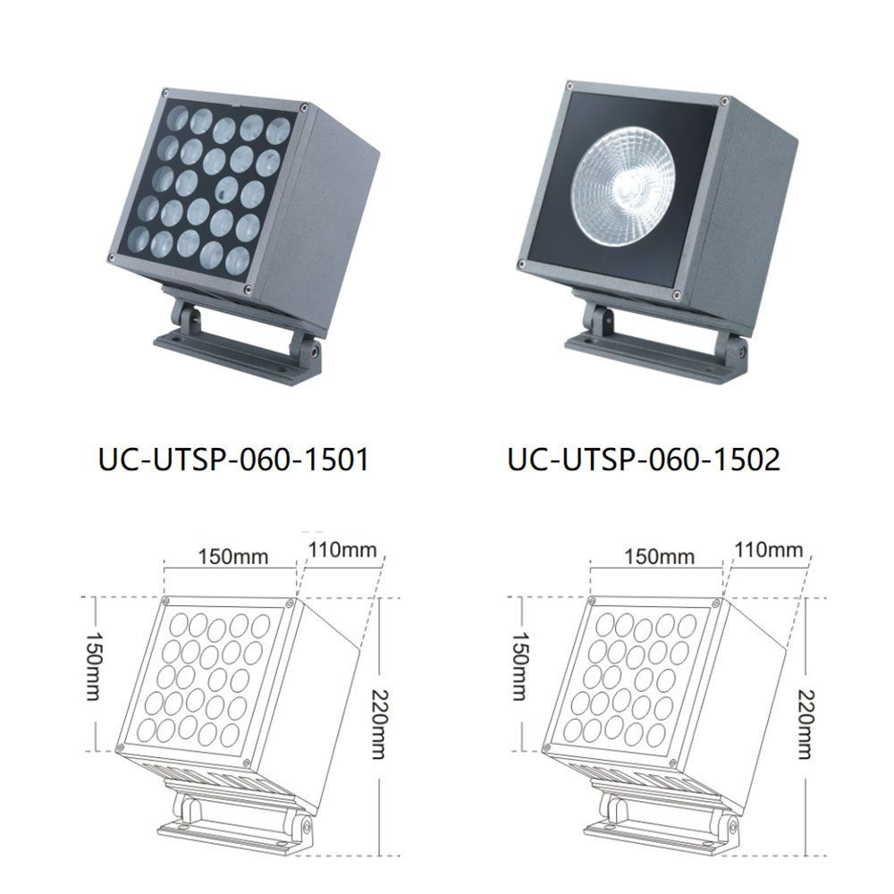 | UC-UTSP-060-1502 | CREE 3535 24*2W/OSRAM 3030 24W/DTJ 10°/20°/30°/YSG 9*4W | 150*110*220 | 140*32*53 | 138*138 | / | Cast Aluminum(ADC12) | Meanwell/ Inventronics | 1800K-6500K | IP67 |