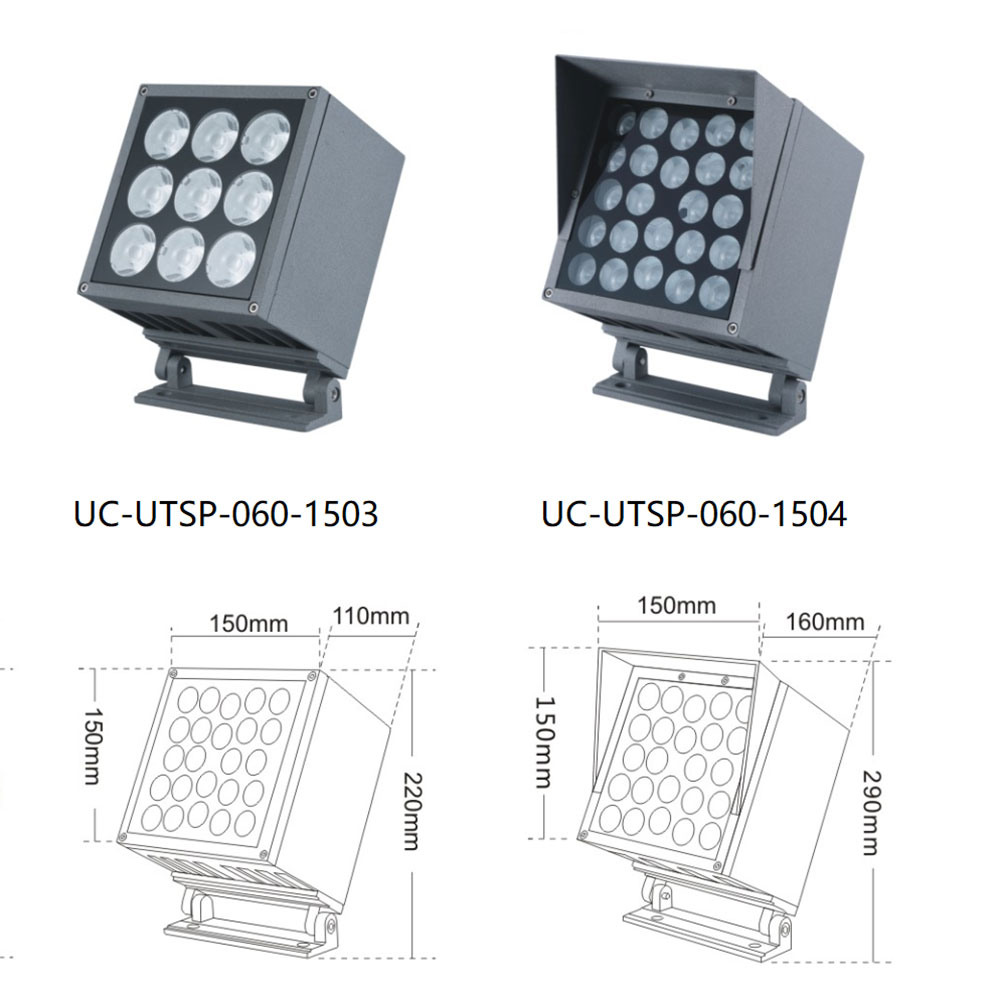 | UC-UTSP-060-1504 | CREE 3535 24*2W/OSRAM 3030 24W/DTJ 10°/20°/30°/YSG 9*4W | 150*160*290 | 140*32*53 | 138*138 | / | Cast Aluminum(ADC12) | Meanwell/ Inventronics | 1800K-6500K | IP67 |