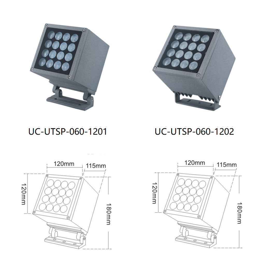 | UC-UTSP-060-1201 | CREE 3535 16*2W/OSRAM 3030 16W/DTJ 10°/20°/30° | 120*115*180 | 112*112*35 | 110.5*110.5 | / | Cast Aluminum(ADC12) | Meanwell/ Inventronics | 1800K-6500K | IP67 |