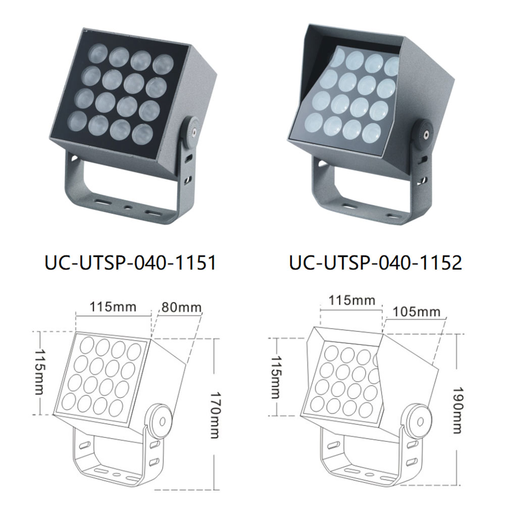 | UC-UTSP-040-1152 | CREE 3535 12*2W / 16*1.8W/OSRAM 3030 16W | 115*105*190 | 95*31*50 | 99*99 | / | Cast Aluminum(ADC12) | Meanwell/ Inventronics | 1800K-6500K | IP67 |