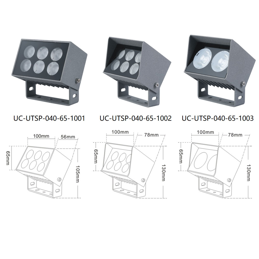 | UC-UTSP-040-65-1001 | CREE 3535 6*2W/OSRAM 3030 6W/YSG 2*(3-5)W | 100*56*105 | 83*27*25 | 83*48 | / | Cast Aluminum(ADC12) | Meanwell/ Inventronics | 1800K-6500K | IP67 |