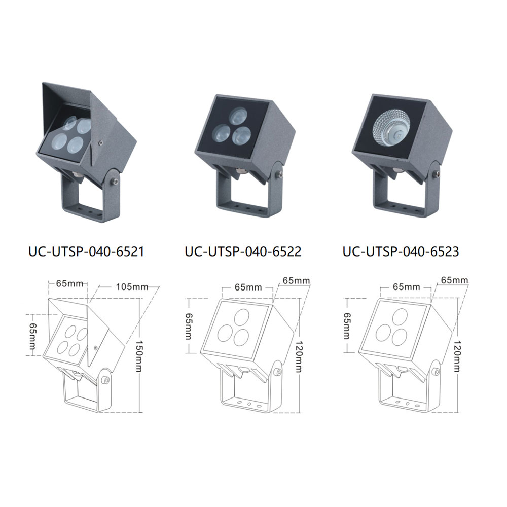 | UC-UTSP-040-6521 | CREE 3535 3W/4*2WOSRAM 3030 3W/4W/COB 38°/YSG | 65*105*150 | 50*25*20 | 49*49 | / | Cast Aluminum(ADC12) | Meanwell/ Inventronics | 1800K-6500K | IP67 |