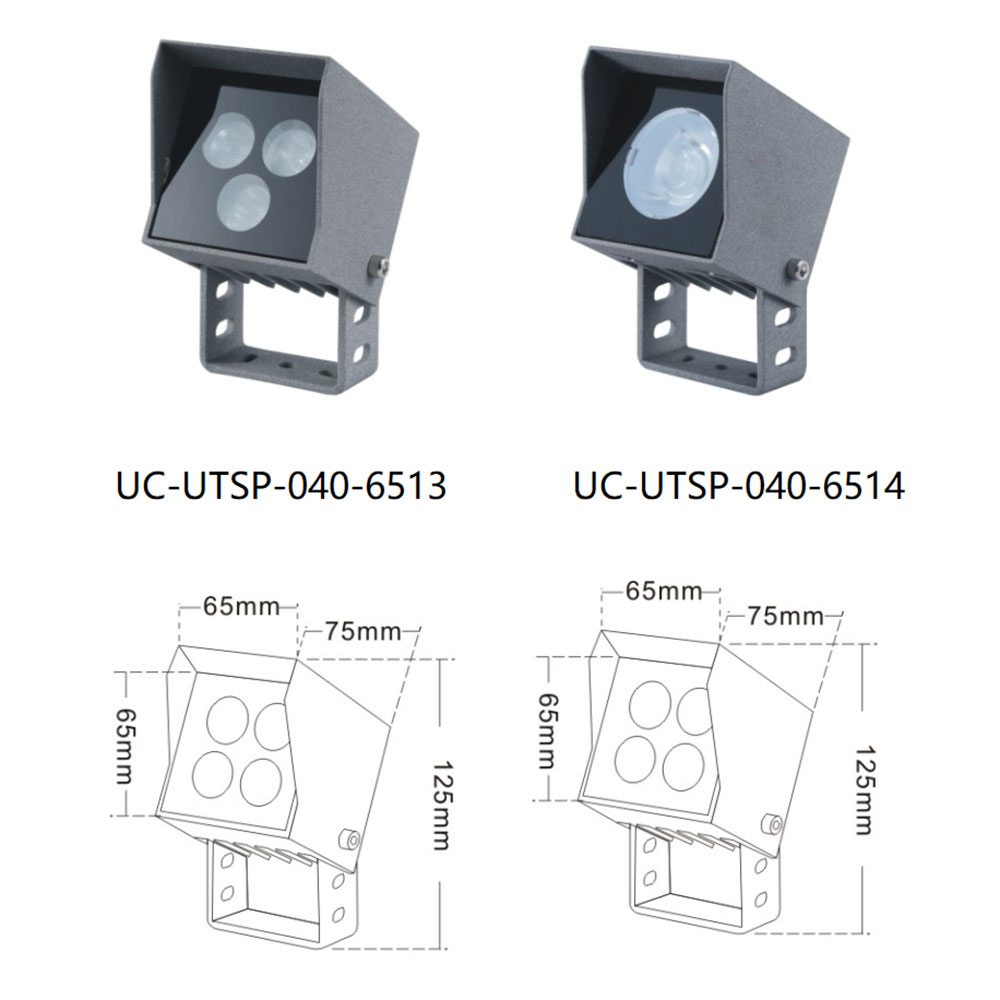 | UC-UTSP-040-6514 | CREE 3535 3W/4*2W/OSRAM 3030 3W/4W/COB 38°/YSG | 65*75*125 | 57*23*23 | 49*49 | / | Cast Aluminum(ADC12) | Meanwell/ Inventronics | 1800K-6500K | IP67 |