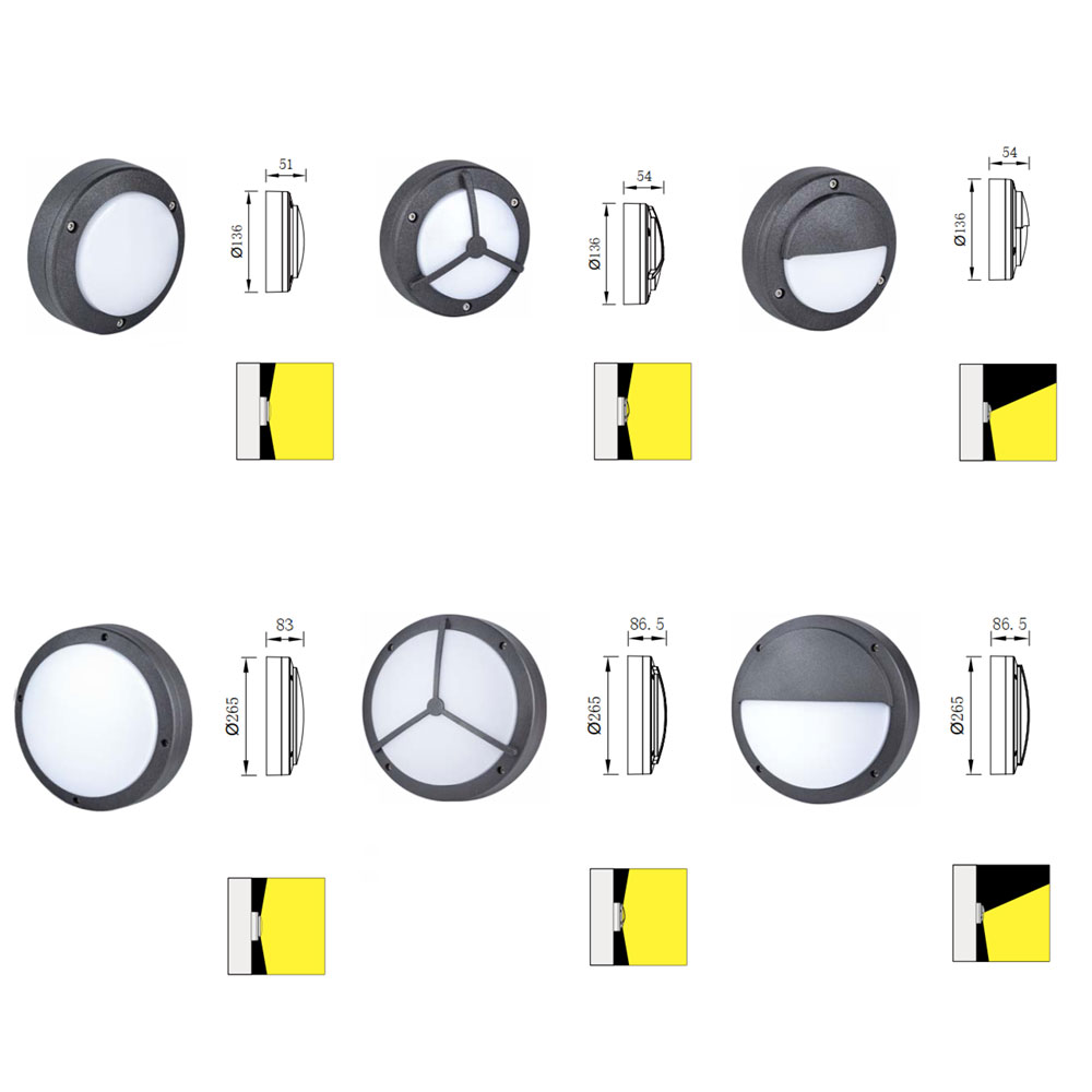 | B-003110M | OSRAM 16W | Ø265x83 | / | Aluminum alloy, die casting aluminum lamp body;Opal PC cover;Waterproof silicone rubber gasket;Pure polyester outdoor powder coating. | ≥80 | 3000-6000K | IP65 |