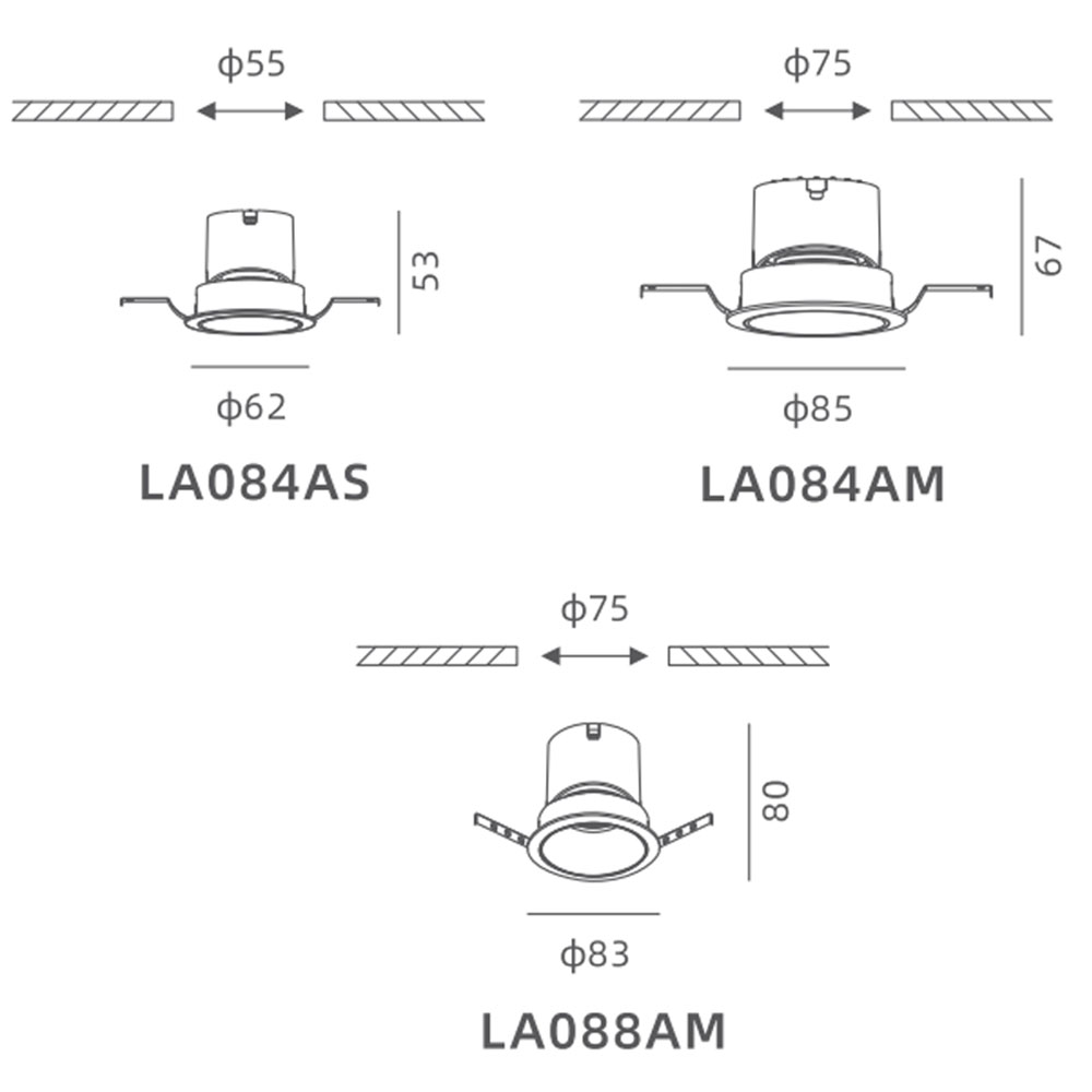 | LA084AM | | Φ85x67 | Φ75 | 7W/9W/12W | 980lm 12W | Aluminum | 3000K/4000K/5000K | ≥90 | 24°/36°/50° |