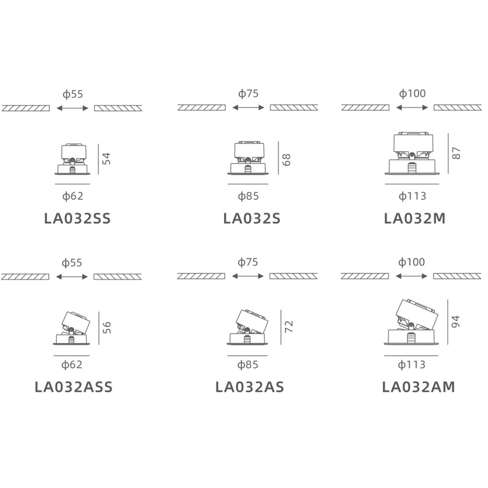 | LA032SS | Φ62x54 | Φ55 | 7W | 430lm | Aluminum | 3000K/4000K/5000K | ≥90 | 15°/24°/36° | |