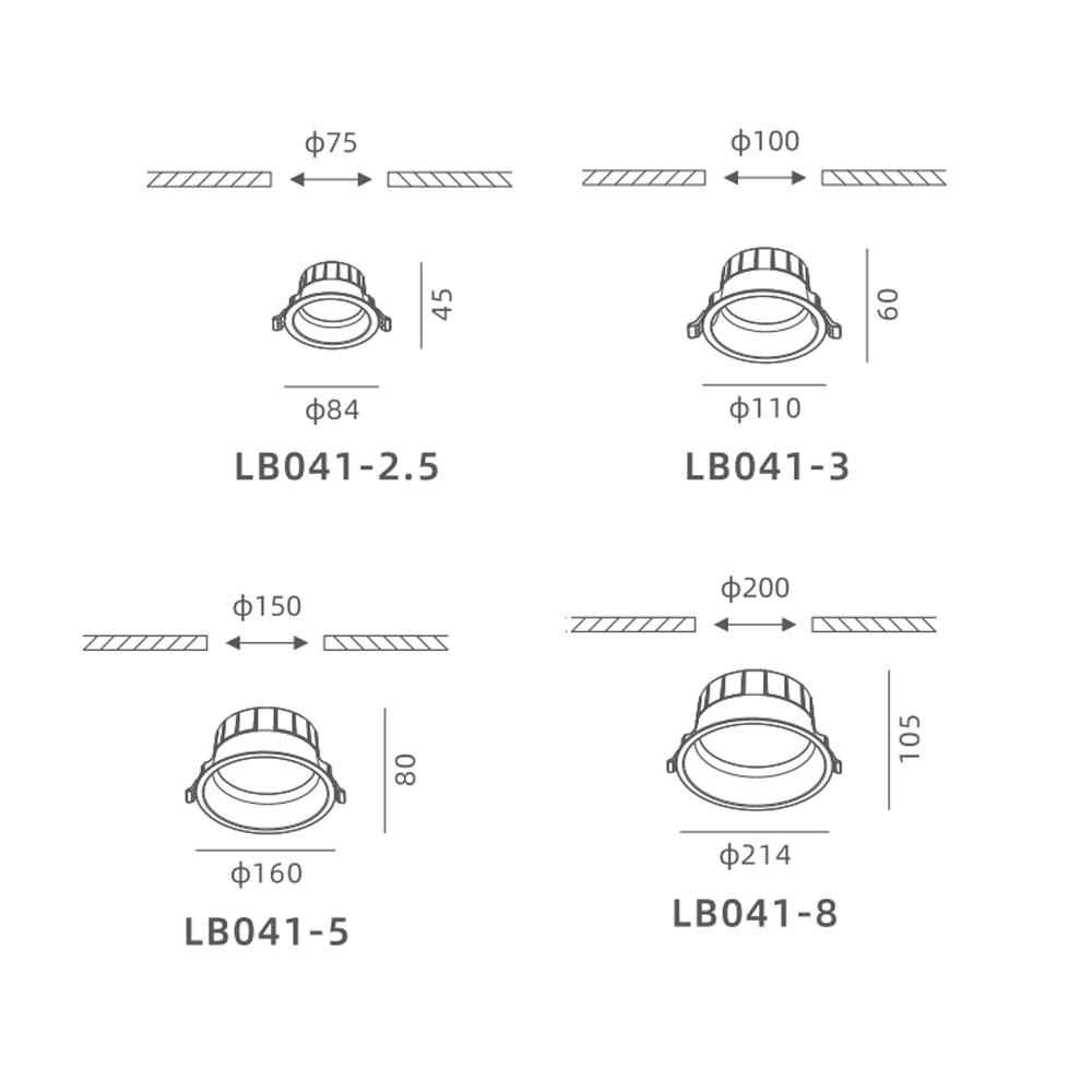 | LB041-2.5 | | Φ84x45 | Φ75 | 10W | 1200lm | Aluminum | 3000K/4000K/5000K | ≥90 | 75° |