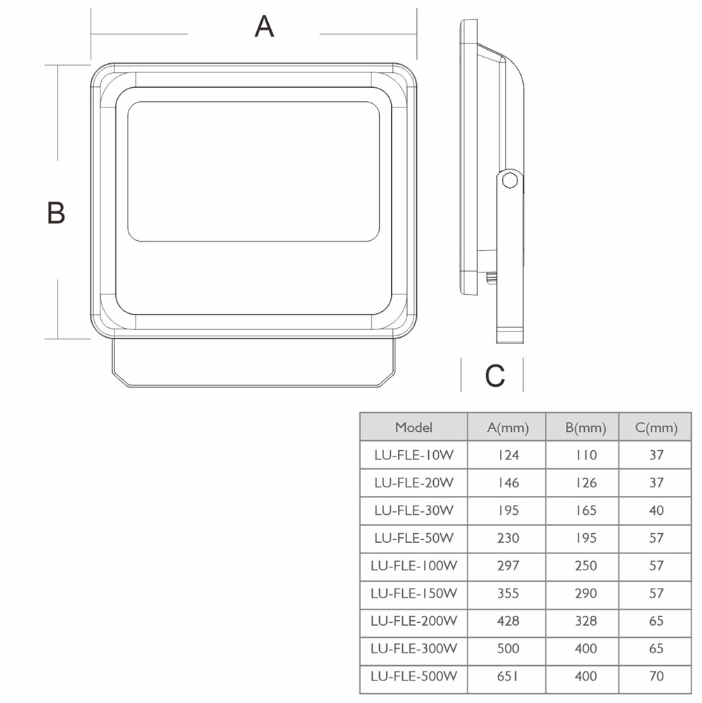 | LU-FLE-300W | 300 | 500×400×65 | 30000 / 36000 | Alu. | Hahga | >70 / 80 | 2700–6500 | IP66, IK10 | 90° / 120° | Photocell, Motion, 0–10V, DALI |