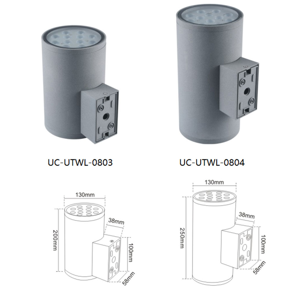 | UC-UTWL-0804 | CREE 3535 12W*2/OSRAM 3030 18W/COB 20W*2头 38° | 138*250*130 | Tube type, driver size 155*105*105/COB type, driver size 105*105*63 | 112 | / | Cast Aluminum(ADC12) | Meanwell/ Inventronics | 1800K-6500K | IP67 |