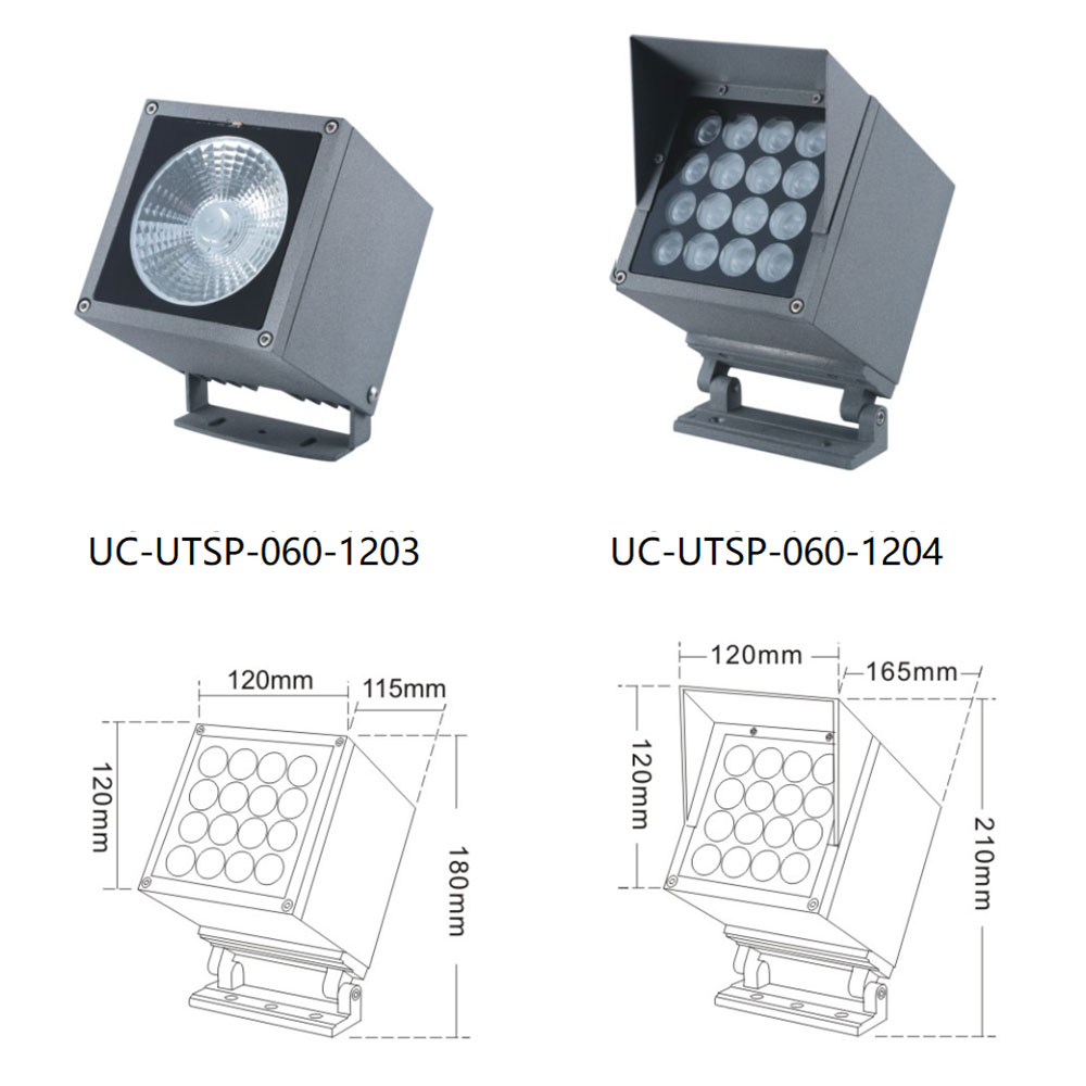 | UC-UTSP-060-1204 | CREE 3535 16*2W/OSRAM 3030 16W/DTJ 10°/20°/30° | 120*165*210 | 112*112*35 | 110.5*110.5 | / | Cast Aluminum(ADC12) | Meanwell/ Inventronics | 1800K-6500K | IP67 |