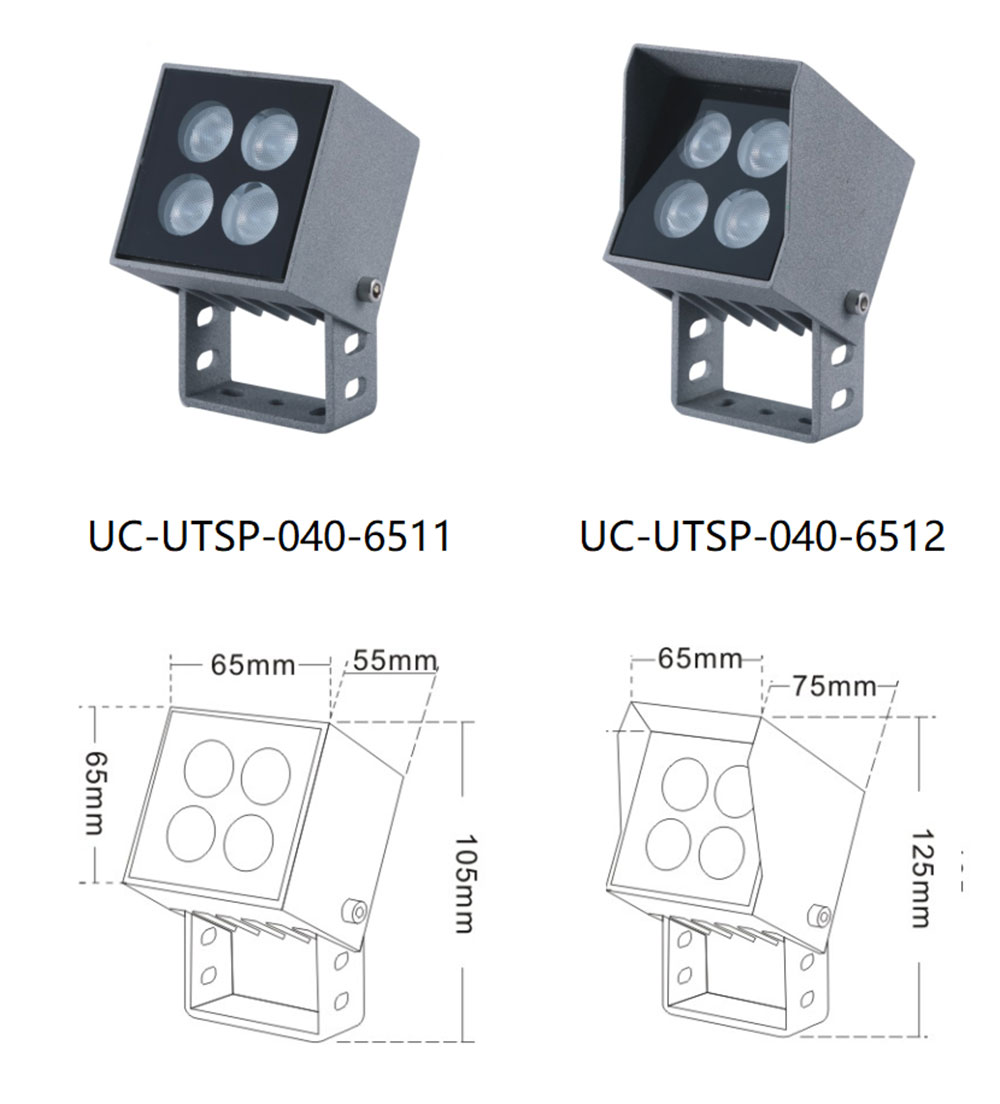 | UC-UTSP-040-6511 | CREE 3535 3W/4*2W/OSRAM 3030 3W/4W/COB 38°/YSG | 65*55*105 | 57*23*23 | 49*49 | / | Cast Aluminum(ADC12) | Meanwell/ Inventronics | 1800K-6500K | IP67 |