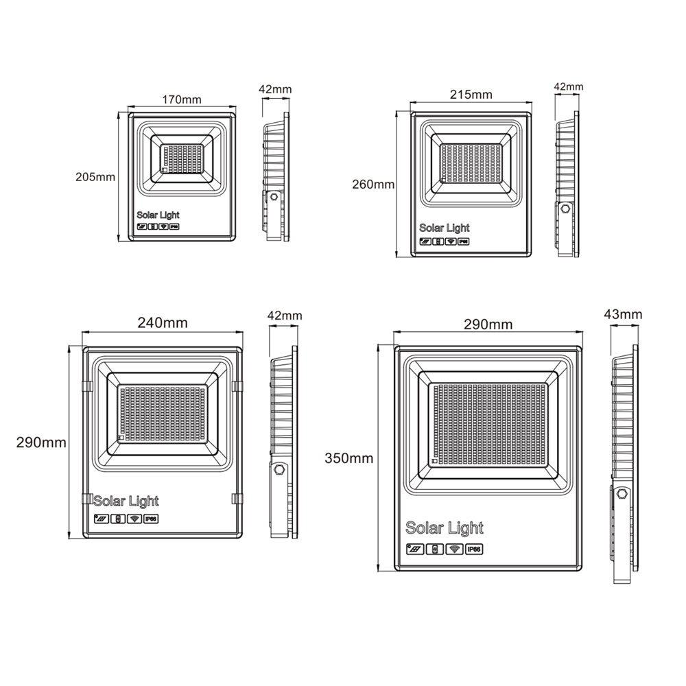 | LUSL-FLV | 350x290x43mm | AC220-240V | 300W | 2600lm | 25W/5V | 25AH 3.2V | 3000-6000K | IP65 | Standard |