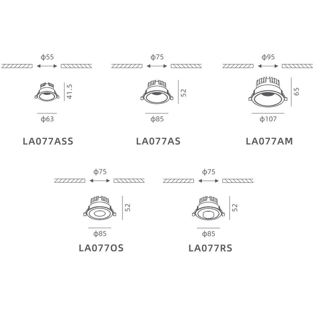 | LA077RS | Φ85x52 | Φ75 | 7W/9W/12W | 730lm 9W | Aluminum | 3000K/4000K/5000K | ≥90 | 24°/36° |