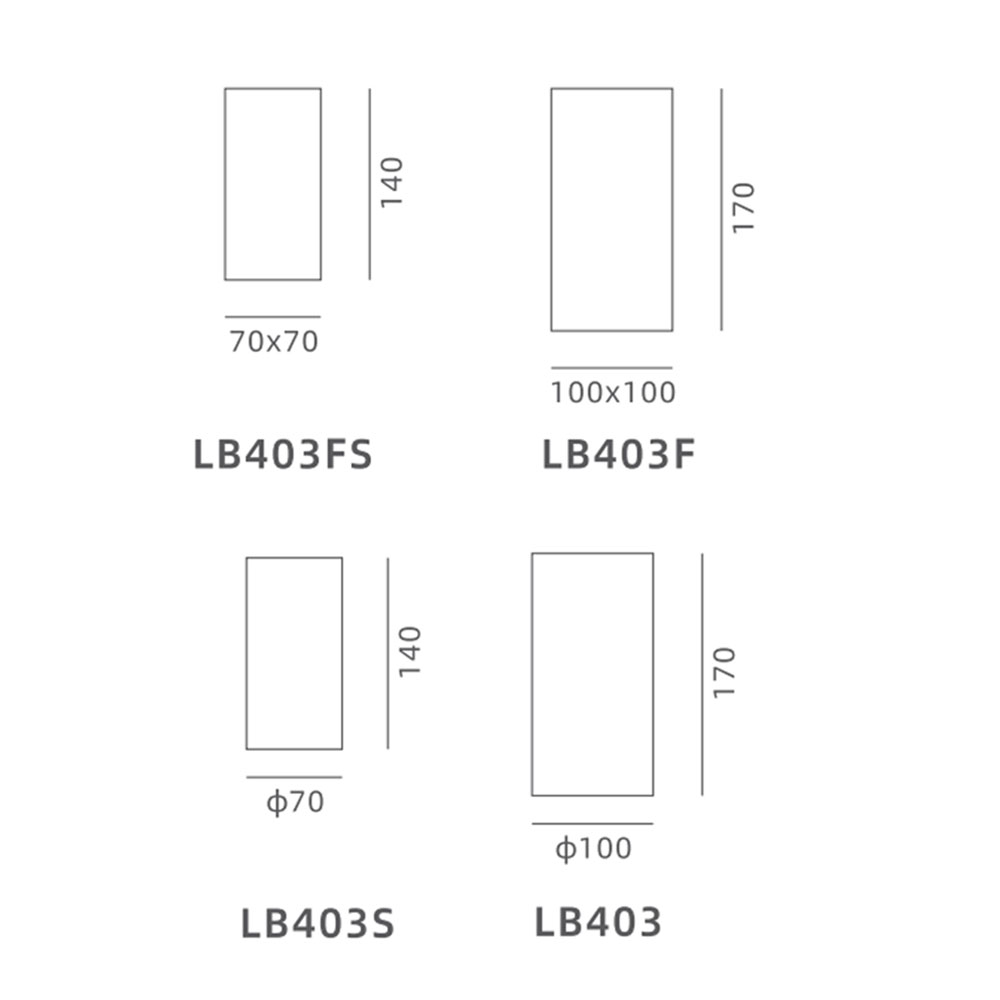 | LB403FS | 70x70x140 | 9W | 630lm | Aluminum | 3000K/4000K/5000K | ≥90 | 15°/24°/36° | |
