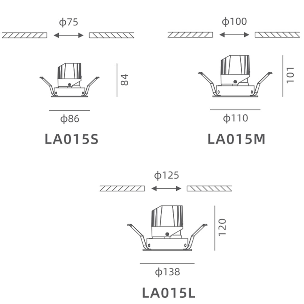 | LA015S | | Φ85x84 | Φ75 | 15W | 1325lm | Aluminum | 3000K/4000K/5000K | ≥90 | 15°/24°/36° |