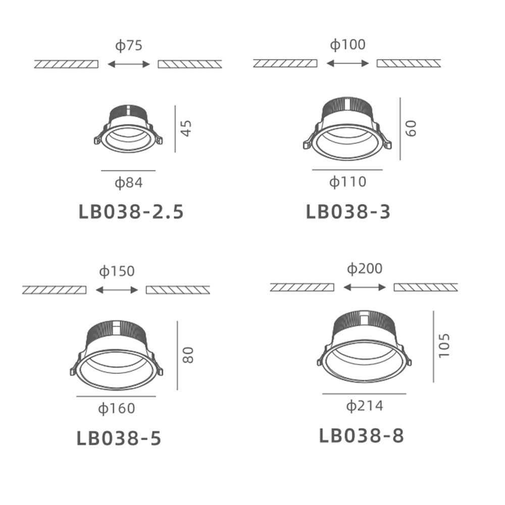 | LB038-2.5 | | Φ84x45 | Φ75 | 6W | 626lm | Aluminum | 3000K/4000K/5000K | ≥90 | 90° |
